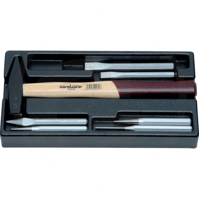 - Zawartość: 6-el., w 1/3 modułu: 1 młotek ślusarski 300 g, 1 przebijak 3 mm, 1 dłuto płaskie 125 + 150 mm, 1 dłuto krzyżowe 125 mm, 1 punktak 4 mm, 1 wybijak 4 mm