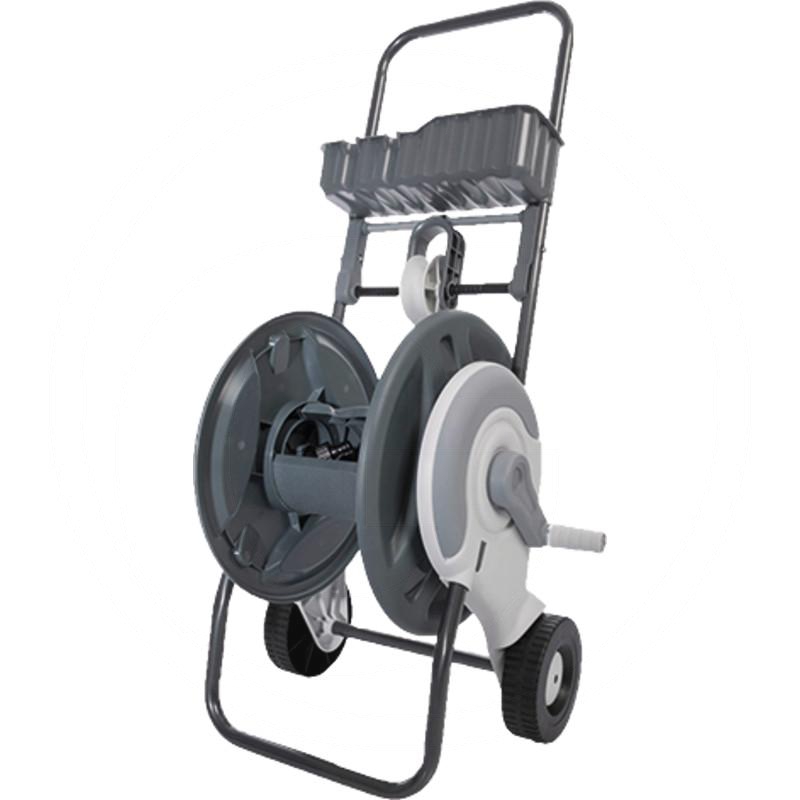 - Zawartość zestawu: wózek na węże z 2 przyłączami kurka i 2 szybkozłączami do węża 1/2"