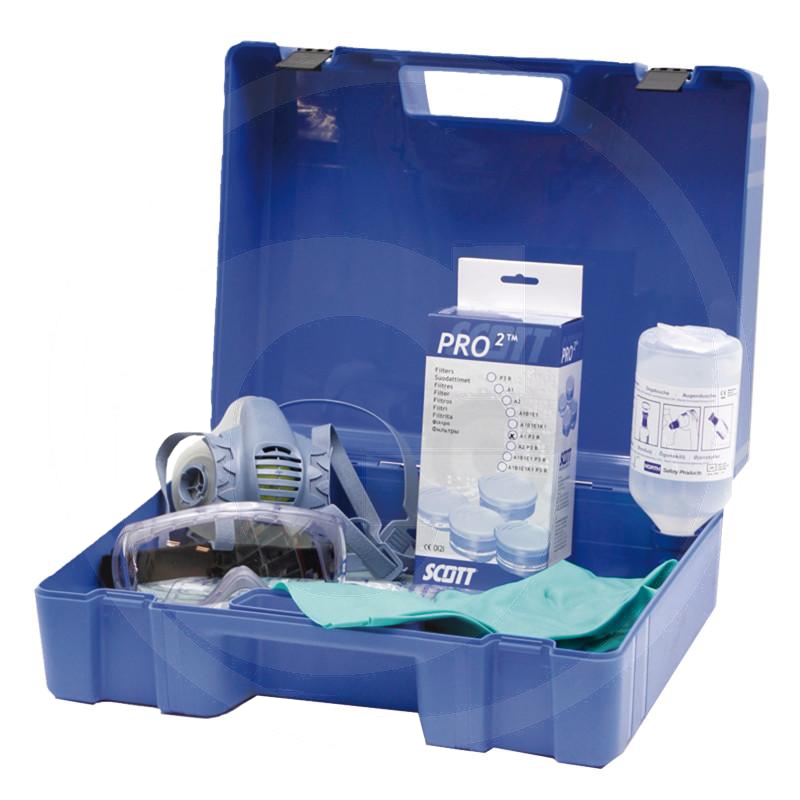 - Wersja: w skrzynce z 1x ubiorem Wodes Agrisafe rozm. XL, rękawicami uniwersalnymi rozm. 10, półmaską 2, filtrem A1-P3, okularami i butelką do przepłukiwania oczu